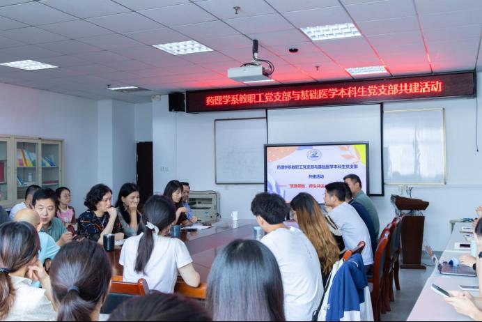 为深入学习贯彻习近平新时代中国特色社会主义思想和党的二十大精神,全面贯彻落实二十届三中全会精神、全国教育大会精神和学校第五次党代会精神,基础医学院党委创新实施“五个一”领航工程,根据学院党委统一部署,药理学系教师党支部与基础医学本科生党支部开展“1+1”结对共建活动。药理学系教师党支部入选全国第三批“双带头人”教师党支部书记工作室,全国“强国行”专项行动团队,坚持党建与业务“双轮驱动、双融双促”。为做好结对共建活动,药理学系教师党支部经过多次研讨形成了活动方案。首次共建活动精心设计了“医路领航,师生共话未来”的基础医学专业职业生涯规划主题座谈会,2025年6月12日在基础医学院药理学系会议室举行,会议由药理学系教师党支部副书记龙利红主持。药理学系教师党支部全体在职党员12人,基础医学本科生党支部党员40人参加了本次会议。
