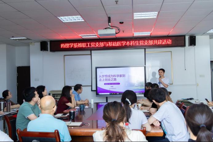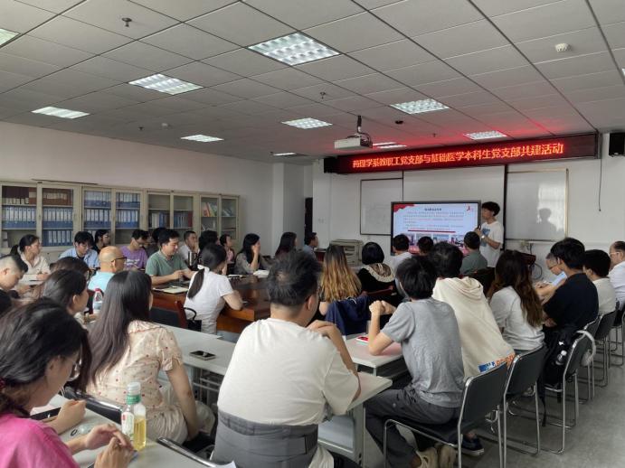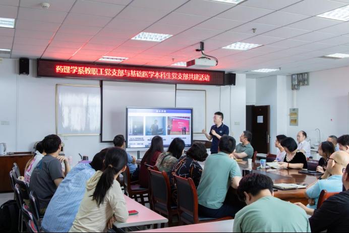 首先,药理学系教师党支部书记王芳介绍了药理学系教师党支部的基本情况和“党建+业务”的优良传统,阐释了开展师生党支部结对共建活动的重要意义,说明了本次会议主题的设计思路。基础医学专业学生党支部书记付镠丁介绍了基础医学本科生党支部的基本情况,并分享了支部党员在服务群众等方面发挥的先锋模范示范作用。