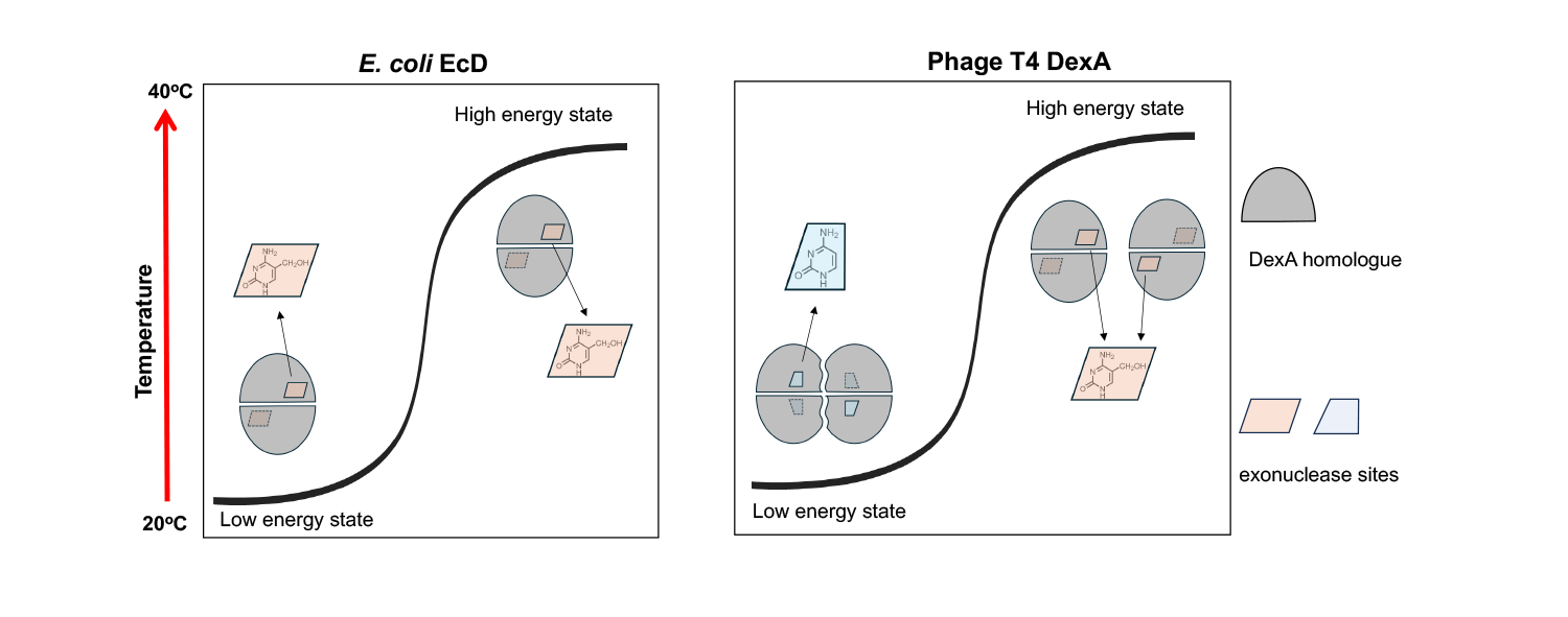 更为重要的是,研究发现大肠杆菌自身编码的DexA同源蛋白EcD,其结构模拟DexA的二聚体状态,专一识别并降解5hmC修饰的噬菌体DNA,形成了对T4噬菌体的天然防御机制。这是一种“共用分子骨架、对立生物功能”的典型例证,展现出病毒与宿主在进化中共用一套机制进行彼此博弈的罕见现象。