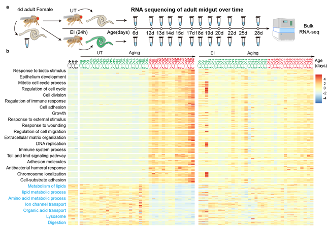 a,果蝇肠道转录组测序流程图。b,按时间顺序将UT组和EI组果蝇肠道转录组中差异表达最显著的基因从4天到28天进行表达水平的热图分析。
