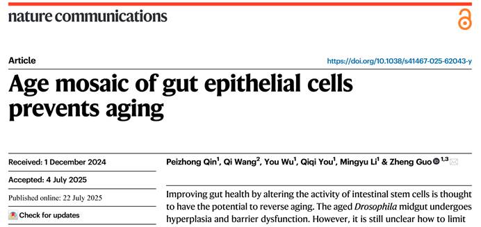 2025年7月22日,华中科技大学同济医学院基础医学院郭峥教授团队在 Nature communications 上发表题为“Age mosaic of gut epithelial cells prevents aging”的研究论文。该研究揭示了果蝇肠道上皮细胞通过形成年龄镶嵌改善肠道健康、延长寿命。