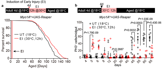 a-b,早期损伤延长了果蝇寿命。b,早期损伤缓解了衰老时ISC的过度增殖的突然发生。