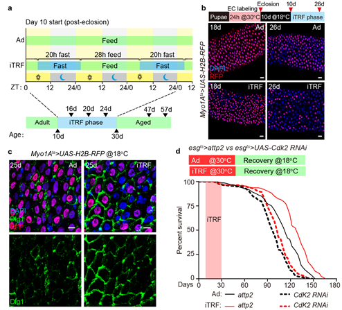 a,对果蝇进行自由进食(ad libitum,Ad)和限时性间歇性进食(intermittent time-restricted feeding,iTRF)处理的示意图。b-c,iTRF诱导EC的年龄镶嵌改善了EC间的SJ。d,阻止EC形成年龄镶嵌削弱了iTRF调控的寿命延长。