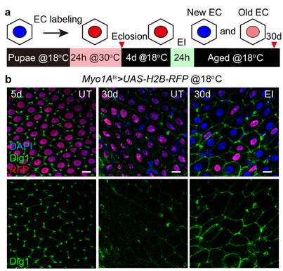 a,在果蝇蛹期肠道短暂诱导H2B-RFP的表达来标记和追踪EC并检测EC间的隔膜连接的示意图。b,相对于5天时UT组RFP+EC间的隔膜连接蛋白组分Dlg1的较高表达水平,30天时UT组RFP+EC之间的Dlg1的表达强度显著减弱。但是与UT组30天时肠道EC之间的Dlg1表达相比,30天时EI组EC之间Dlg1的表达水平均显著增强。