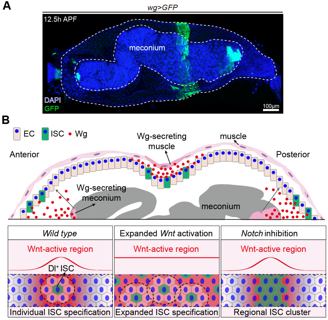 A.12.5h APF时,肠道中wg>GFP表达的代表图像。上图:包含胎粪的中肠。下图:分离出来的胎粪。B.肠道ISC命运选择的模型:(上图)肌肉和胎粪中的Wg分泌建立了ISC选择的区域。Notch信号在这些区域内介导侧向抑制,以完善ISC的命运选择。(下图)野生型、Wnt过表达和Notch抑制条件下的ISC分布模式。