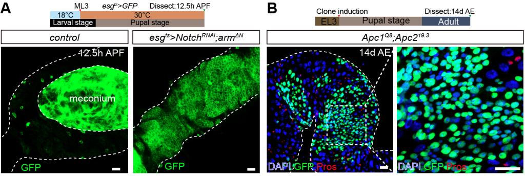 A.在12.5h APF 时,对照组(esgts>GFP)和 esgts>NotchRNAi+armΔN 中 ISC(esg>GFP)的代表性图像。B.Apc1Q8Apc219.3MARCM克隆的代表性图像,在幼虫 EL3 阶段开始诱导克隆,在出蛹后14天检测。