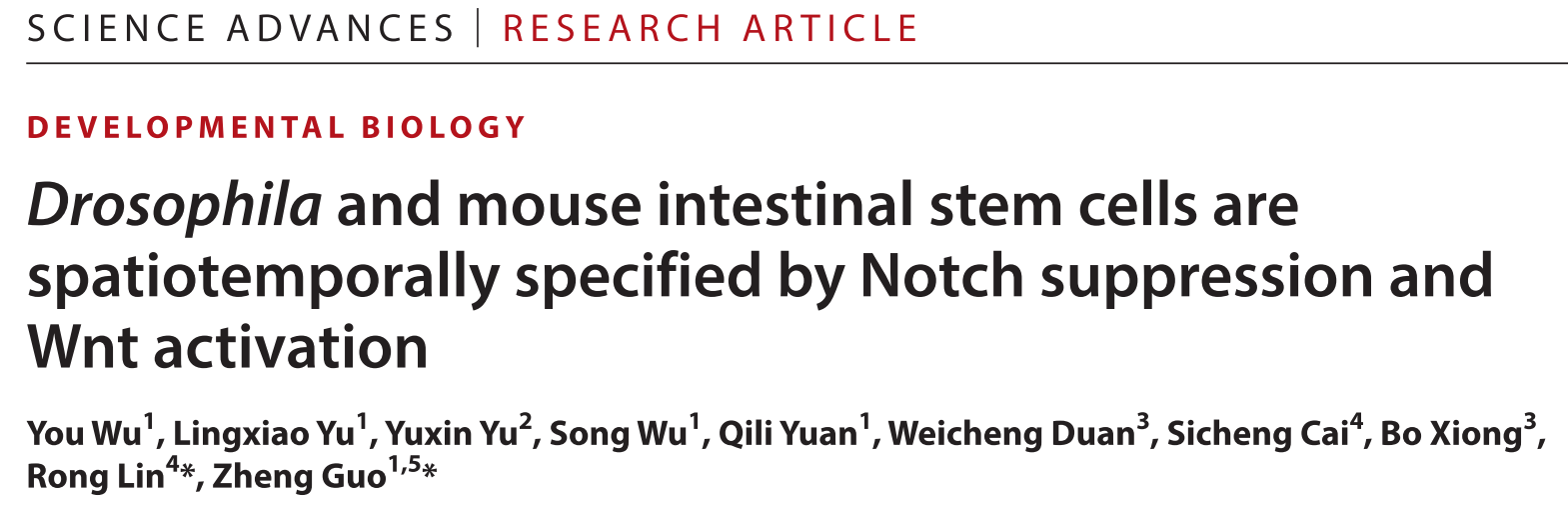 2025年12月3日,华中科技大学同济医学院郭峥教授课题组与华中科技大学同济医学院附属协和医院蔺蓉教授课题组合作在Science Advances杂志在线发表了题为Drosophila and mouse intestinal stem cells are spatio-temporally specified by Notch suppression and Wnt activation的研究论文。该研究阐明了ISC命运选择的核心机制:Wnt与Notch信号通路的时空协同作用实现了ISC的命运决定:Wnt激活区域划定了选择范围,而范围内的上皮细胞通过Notch信号通路进行命运选择。