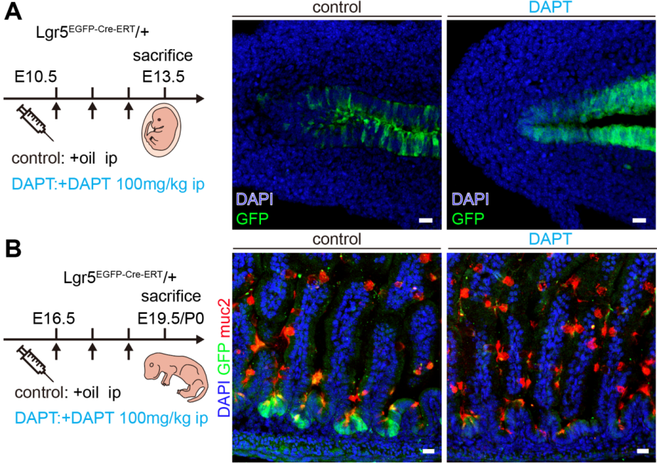 A.纵切面显示E10.5至E12.5期间对照组和DAPT处理小鼠E13.5肠道的Lgr5-EGFP+ 染色情况。B.E16.5至E18.5期间对照组和DAPT治疗组小鼠P0小肠中Lgr5-EGFP+ 和杯状细胞的Muc2染色。
