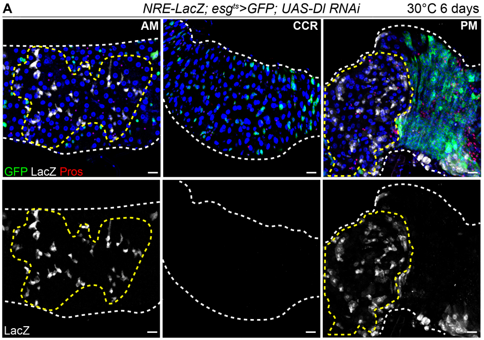 郭峥教授团队发现,在果蝇中肠中部的铜细胞区(CCR),干细胞和其子代细胞(esg+ 细胞)中Notch信号的激活水平显著低于中肠前段(anterior midgut, AM)和中肠后段(posterior midgut,PM)。他们在排除了配体缺乏、受体不足等原因后,通过在esg+ 细胞中表达一系列处于不同激活阶段Notch受体的变体,发现依赖S2剪切的Notch受体在CCR中无法被激活。这提示CCR中Notch的S2剪切受到了限制,导致激活受阻。