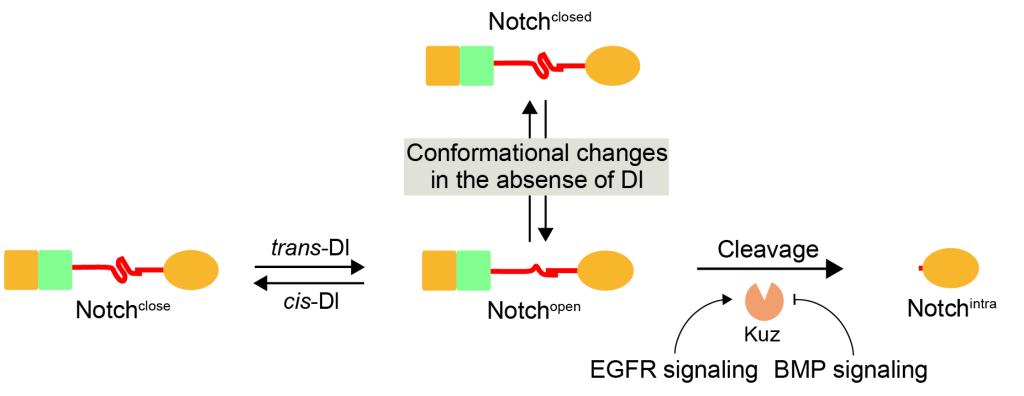 Notch信号通路介导相邻细胞间通讯,对细胞命运决定和组织稳态起到了至关重要的作用。现有的模型认为当反式配体(trans-ligand)结合Notch后,在机械力的作用下配体打开Notch受体原本闭合的NRR结构域,暴露出S2切割位点,发生金属蛋白酶Kuzbanian(Kuz)/ADAM10依赖的S2剪切切割,继而发生S3剪切,完成Notch受体的激活。目前普遍认为Kuz是组成性表达,并不参与Notch的激活水平和激活位置/空间的调控。
