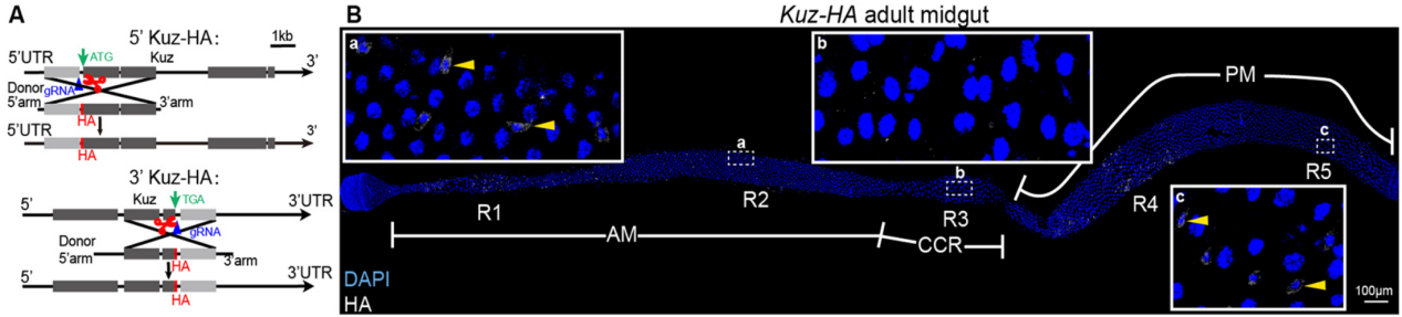 图1:Kuz-HA表达在AM与PM的esg+ 细胞膜,而难以在CCR区检测到表达。