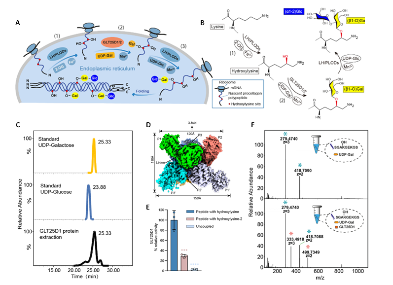 胶原蛋白是哺乳动物体内含量最多的蛋白质,约占人体总蛋白量30% 以上,是细胞外基质的重要组分,主要发挥结构性作用。胶原蛋白的糖基化修饰对于其三股螺旋的组装以及在细胞外基质中的功能发挥具有重要意义。该糖基化过程发生于内质网中,其中关键的初始步骤由半乳糖基转移酶GLT25D1催化,其将半乳糖残基转移至胶原蛋白保守重复基序“Gly-Xaa-Hyl”中的羟赖氨酸位点,形成半乳糖基化羟赖氨酸。GLT25D1介导的糖基化功能异常与多种疾病的发生发展密切相关。因此深入阐明其催化机制及相关疾病的分子致病机制,能够为靶向胶原异常合成相关疾病的临床诊断与治疗奠定重要基础。