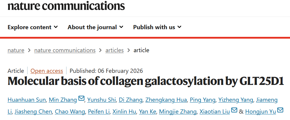 2026年2月6日,华中科技大学基础医学院于洪军教授、张敏副研究员及合作团队在Nature Communications杂志在线发表了题为Molecular basis of collagen galactosylation by GLT25D1的研究论文。该论文发现了GLT25D1的复杂组装模式及其对胶原进行精准半乳糖基化的分子机制,揭示了GLT25D1相关疾病发生的分子机理。