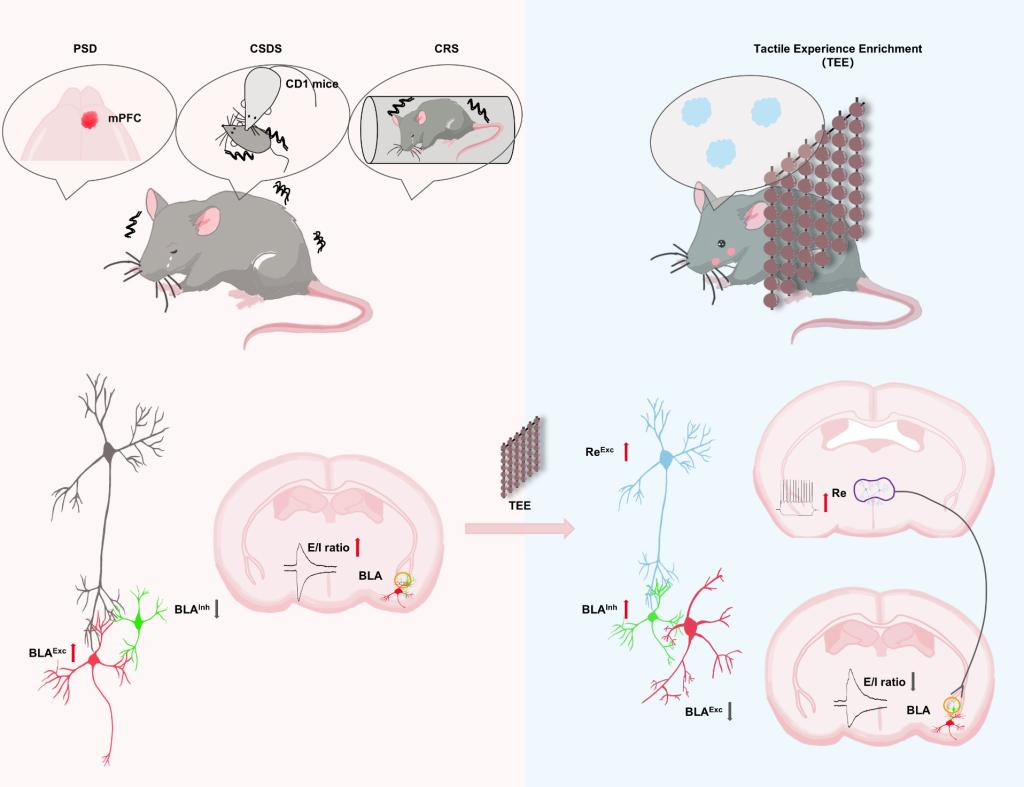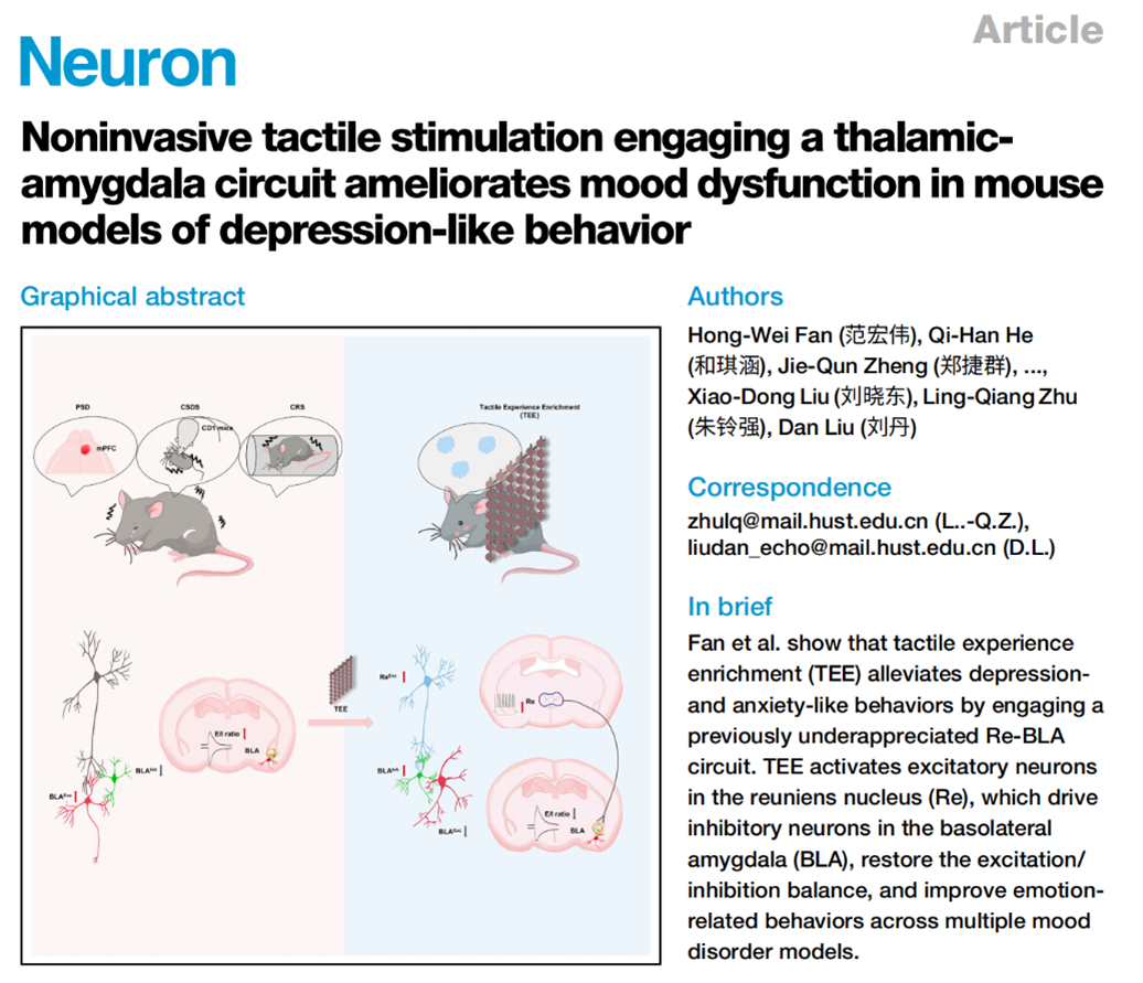 北京时间2026年4月1日,Neuron在线发表华中科技大学刘丹教授与朱铃强教授团队的最新研究。该研究发现,非侵入性的触觉丰富体验(tactile-enriched experience, TEE)能够绕过受损的内侧前额叶皮层相关通路,通过激活丘脑结合核(Re)-基底外侧杏仁核(BLA)这一替代环路,恢复BLA局部兴奋/抑制平衡,从而在多种小鼠模型中显著改善抑郁样和焦虑样行为。