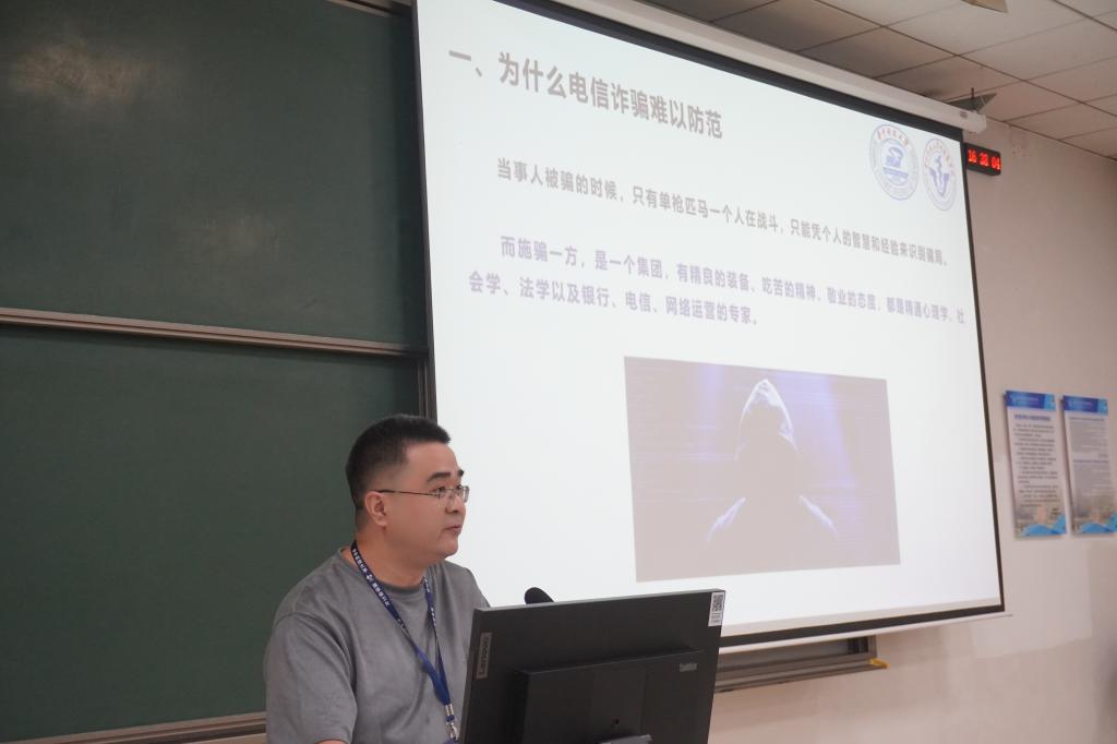 医学保卫处的张杰老师聚焦于“防诈骗和校园安全”,从“网络安全”、“消防安全”、“交通安全”三个方面入手,运用详实的数据和新型案例,为同学们深入讲解了校内安全的重要性和防范措施。张老师的讲解帮助同学们树立了强烈的防范意识,为共建平安校园贡献了力量。
