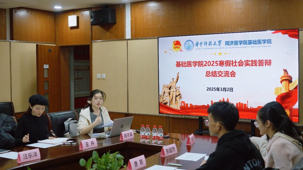 3月2日,华中科技大学同济医学院基础医学院2025年寒假“返家乡”社会实践答辩总结交流会在基础医学院410会议室举行。学院团委副书记王卉老师、校大学生社会实践中心社会实践发展部副部长王温可,院社会实践部张超然、唐响,2024年暑期社会实践优秀实践队队长汪乐洋、2024年寒假“返家乡”社会实践优秀个人吴煜铭等同学出席了此次总结会,并担任评委。
