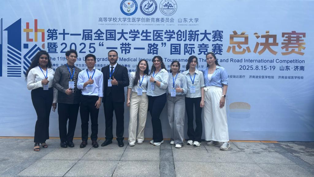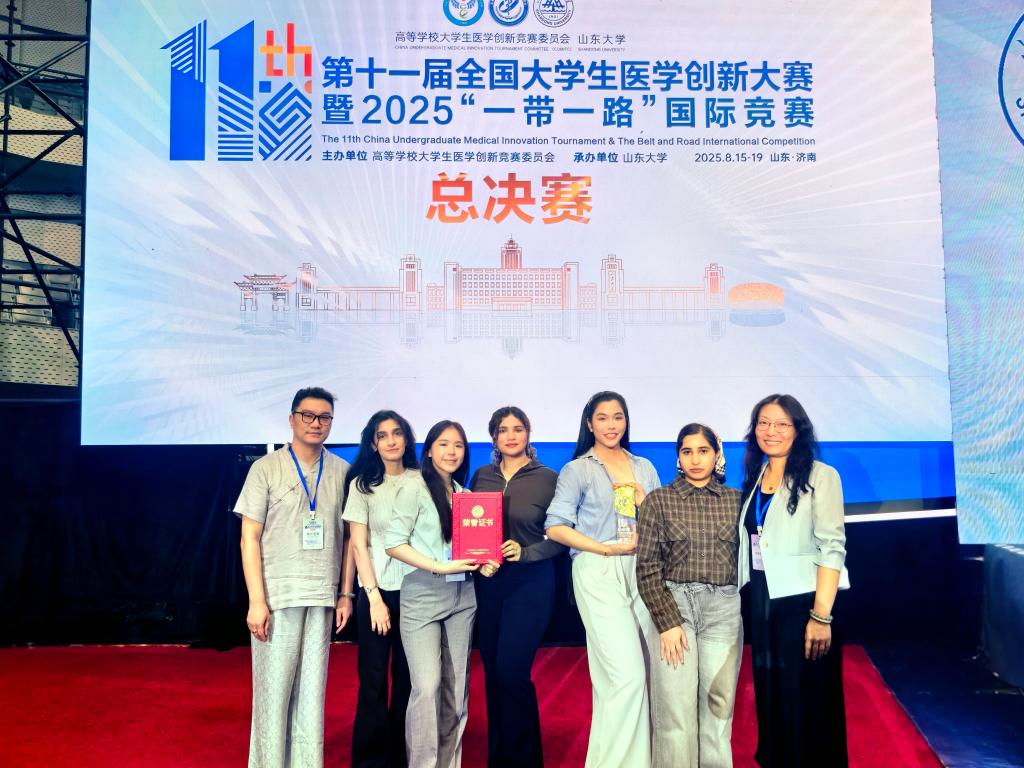8月18日,由高等学校大学生医学创新竞赛委员会主办,山东大学承办的第十一届全国大学生医学创新大赛暨2025“一带一路”国际竞赛在济南落下帷幕。由马来西亚学生TAN ZI YEE(中文名:陈谘仪)作为队长,基础医学院宇兴江教授、席姣娅教授共同指导的项目《低氧微环境下ALYREF调控m5C和m6A互作诱导胶质瘤干细胞自我更新》以优异表现斩获金奖;由菲律宾学生FEDERIGAN JUSTIN NATHEN(中文名:许樟则)作为队长,医管院张研副教授、张韦副教授共同指导的项目《数字健康服务通向全民健康覆盖:卫生系统与政策研究》获得银奖,一金一银的成绩创造了我校国际学生参加医学类竞赛的历史新高。