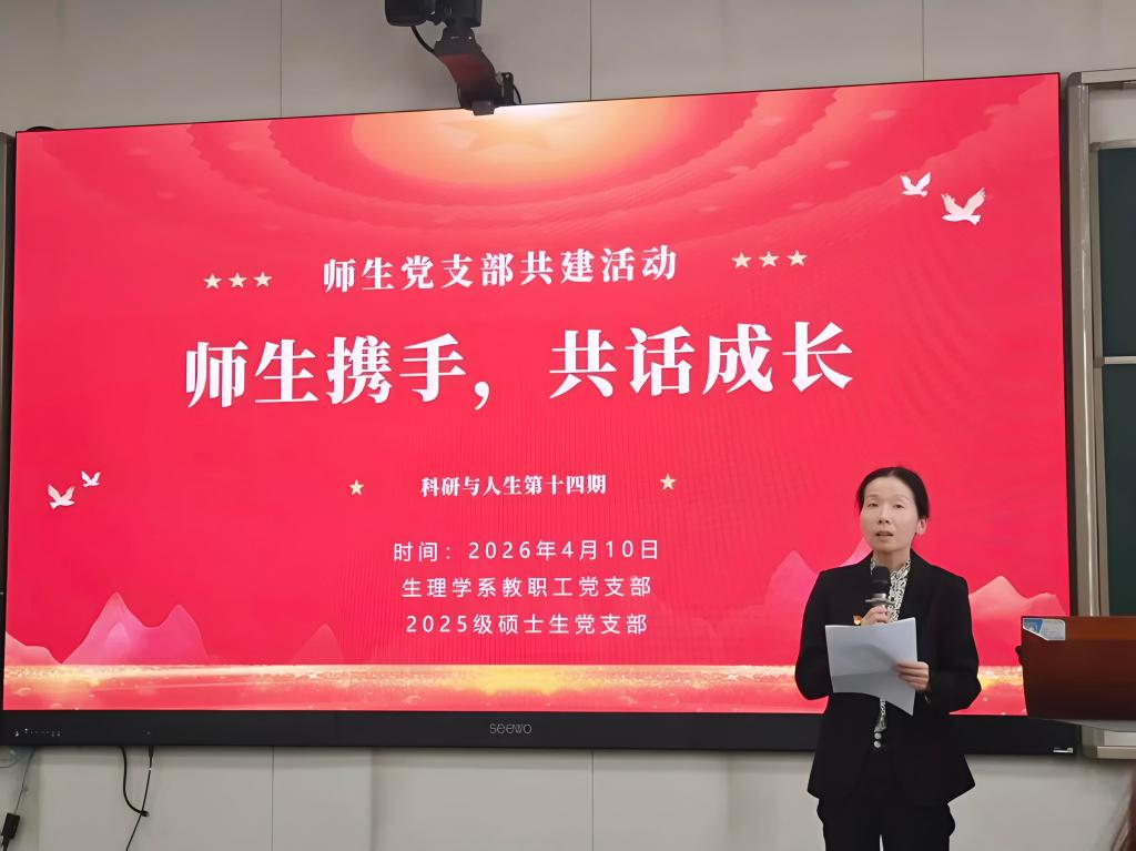 为进一步发挥师生党支部共建的引领作用,搭建师生深度交流的平台,助力研究生科研能力与职业规划能力的提升,2026年4月10日下午,生理学系教职工党支部与2025级硕士生党支部联合举办的“师生携手,共话成长”师生党支部共建学术沙龙暨“科研与人生”第十四期活动,在基础医学院顺利举行。基础医学院党委书记任宇、生理学系全体教师以及2025级硕士生党支部的同学共同参加了此次活动。活动由生理学系罗娟老师主持。