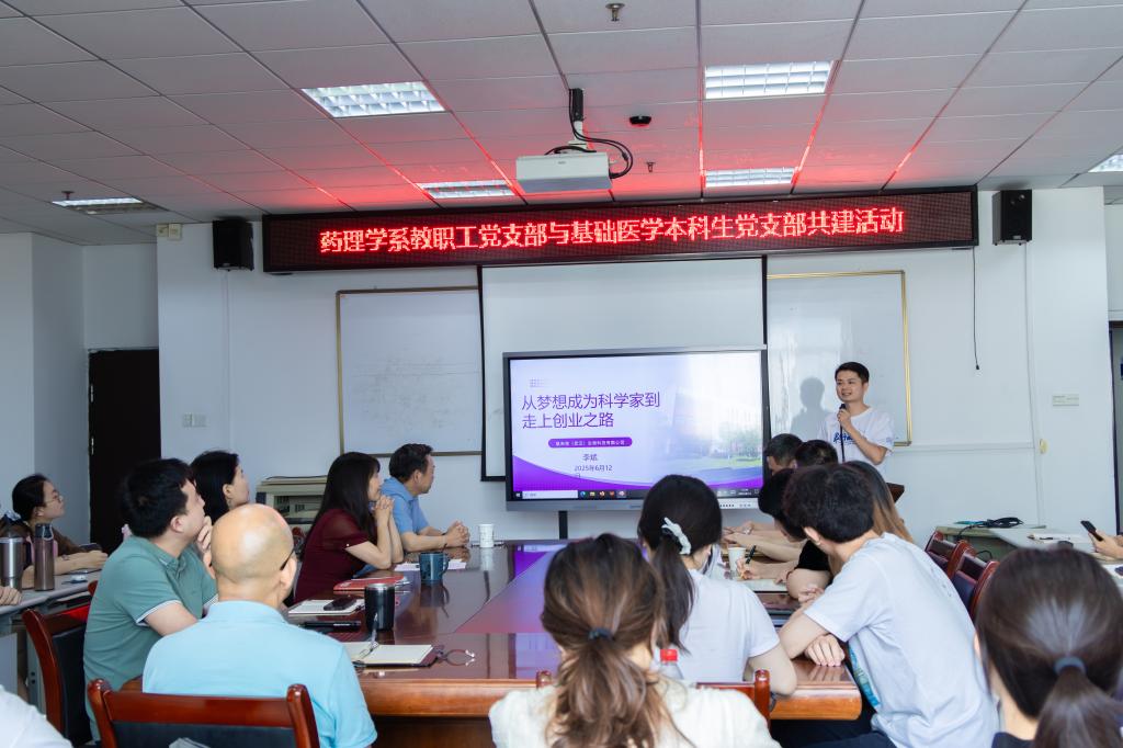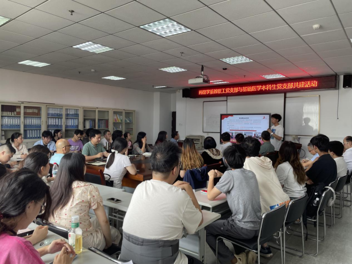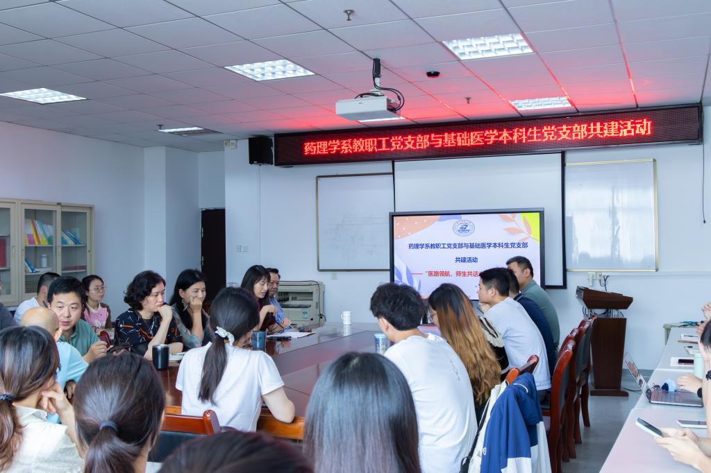 为深入学习贯彻习近平新时代中国特色社会主义思想和党的二十大精神,全面贯彻落实党的二十届三中全会精神、全国教育大会精神和学校第五次党代会精神,基础医学院党委创新实施“五个一”领航工程,根据学院党委统一部署,药理学系教师党支部与基础医学本科生党支部开展“1+1”结对共建活动。药理学系教师党支部入选全国第三批“双带头人”教师党支部书记工作室,全国“强国行”专项行动团队,坚持党建与业务“双轮驱动、双融双促”。为做好结对共建活动,药理学系教师党支部经过多次研讨形成了活动方案。首次共建活动精心设计了“医路领航,师生共话未来”的基础医学专业职业生涯规划主题座谈会,2025年6月12日在基础医学院药理学系会议室举行,会议由药理学系教师党支部副书记龙利红主持。药理学系教师党支部全体在职党员12人,基础医学本科生党支部党员40人参加了本次会议。