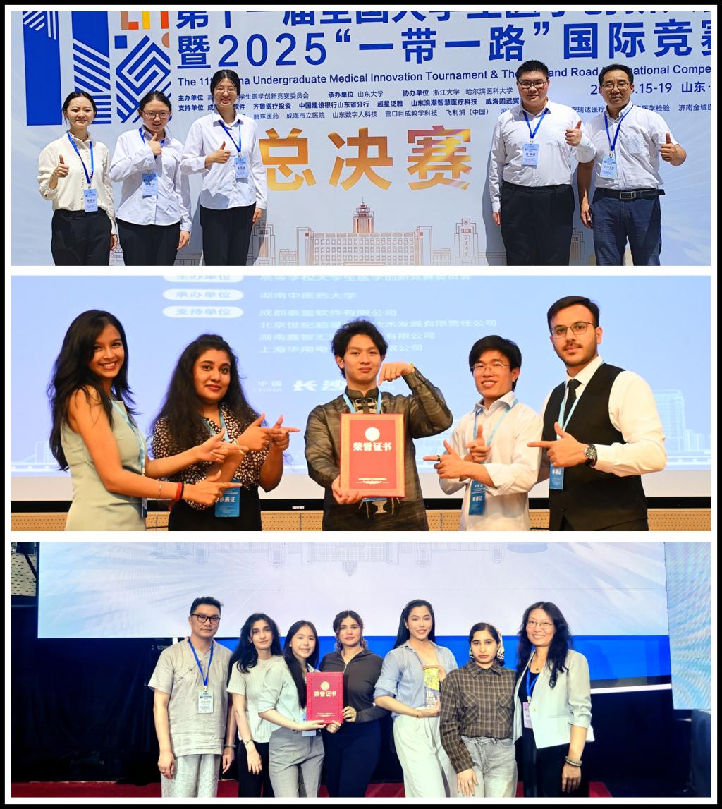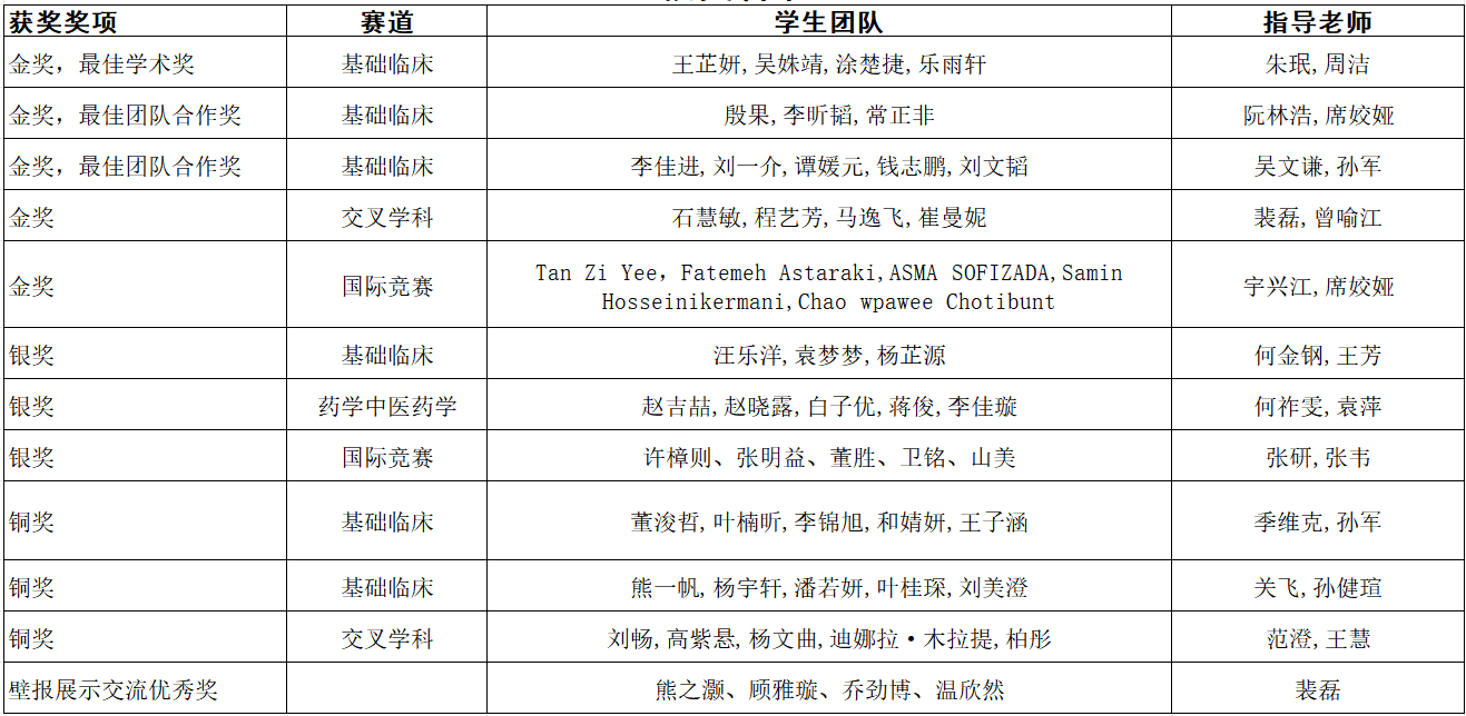 基础医学院组织125支、17支、11支队伍参加了校赛、复赛和总决赛。总决赛11支队伍师生来自基础医学院、第一第二临床学院、电信学院等院系,参加基础临床、药学中医药、交叉学科、国际竞赛4个赛道比赛,获金奖5项、银奖3项、铜奖3项,1支队伍入围冠军争夺赛,获最佳学术奖1项、最佳团队合作奖2项、壁报优秀奖1项。