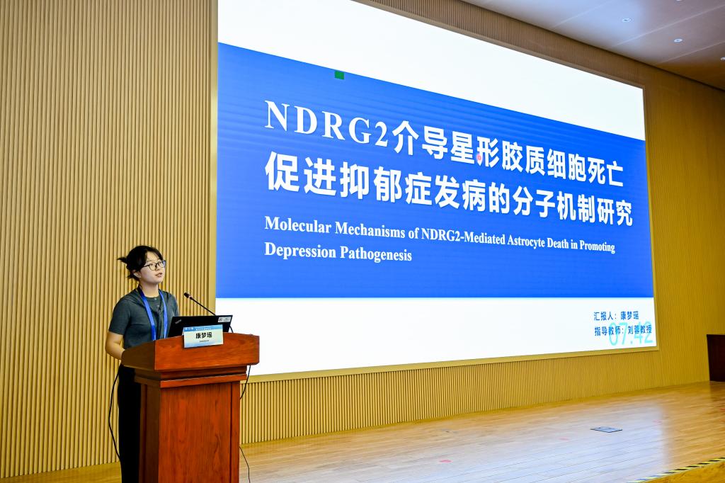 在口头汇报中,来自基础医学(强基)2201班的康梦瑶同学从星形胶质细胞在维持大脑微环境稳态的中的重要作用出发,从细胞实验和动物实验两个层面向全场听众汇报了她们团队关于NDRG2基因在星形胶质细胞中与抑郁症发病机制之间的研究,获评口头汇报二等奖。