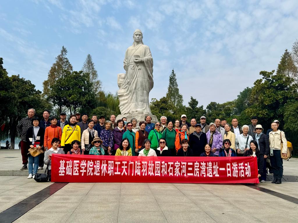 晚秋时节天渐凉,桂花依旧吐芬芳。2025年10月29日,正值中华民族传统敬老佳节--重阳节;基础医学院精心策划了一场“寻迹茶圣故里,探秘文明之源”的文化秋游活动。清晨8时整,58位退休教职工精神矍铄地在学院集结,乘坐旅游大巴奔赴湖北天门,在陆羽故园的茶香古韵与石家河遗址的陶火文明中,开启了一场穿越千年的文化对话。这场重阳雅集不仅为老同志们带来了身心的愉悦,更搭建了一个触摸历史脉搏、传承文化根脉的精神家园。