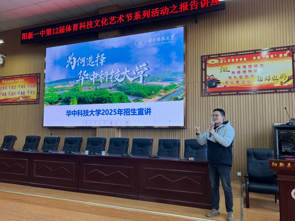李骏锋老师以《为何选择华中科技大学?》为题展开招生宣讲,系统介绍学校作为国家“双一流”建设高校的综合优势、学科特色、师资力量、科研平台及创新人才培养体系,鼓励阳新一中学子积极报考华中科技大学。