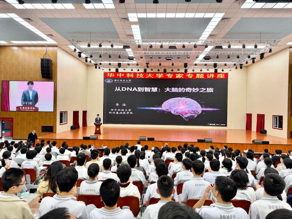 11月22日至23日,病理生理学系李浩副教授前往广西壮族自治区北海中学、北海民附学校及廉州中学开展宣讲。他以《从DNA到智慧——大脑的奇妙之旅》为题,为中学生带来一场融合科学探索与人文关怀的医学前沿讲座。讲座围绕“大脑如何构建智慧”这一主题,从日常生活中的压力与发热反应切入,生动阐释大脑作为人体“总指挥部”与“感知中心”的复杂调控机制,引导学生深入思考生命科学的奥秘。