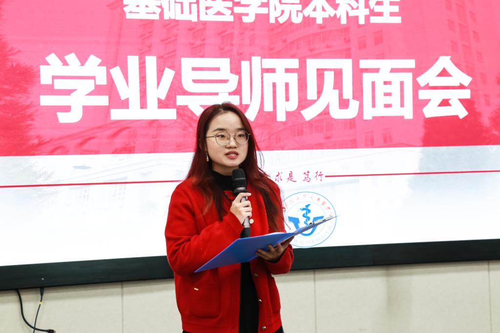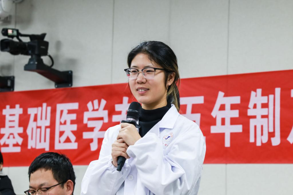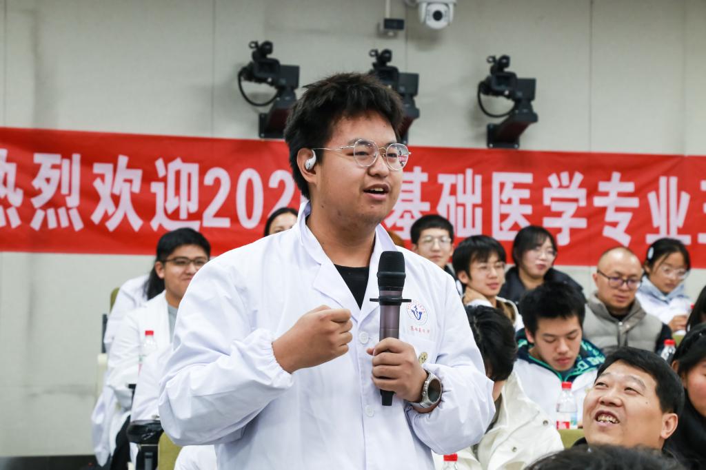 校三好学生标兵、裘法祖奖学金获得者基础医学(强基)2201班刘思彦同学作为优秀老生代表,鼓励学弟学妹们打好理论基础、抓住实验室轮转见习的机会,探索自己的学术兴趣方向,提前做好学业规划,积极主动与导师交流,把握每一个学习机会。