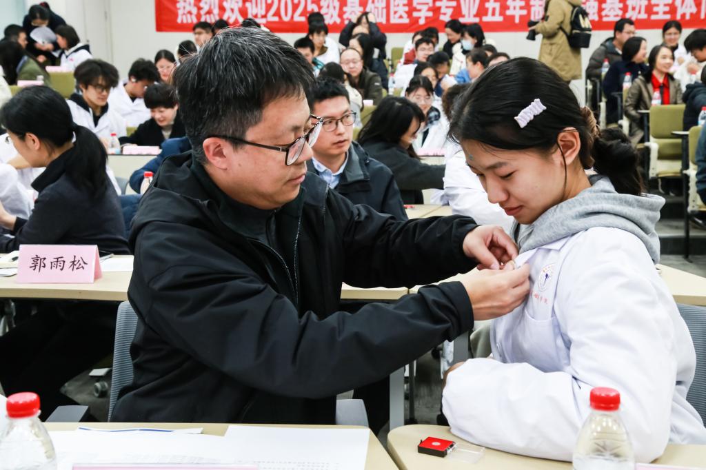 本科生学业导师为25级基础医学专业新生佩戴院徽