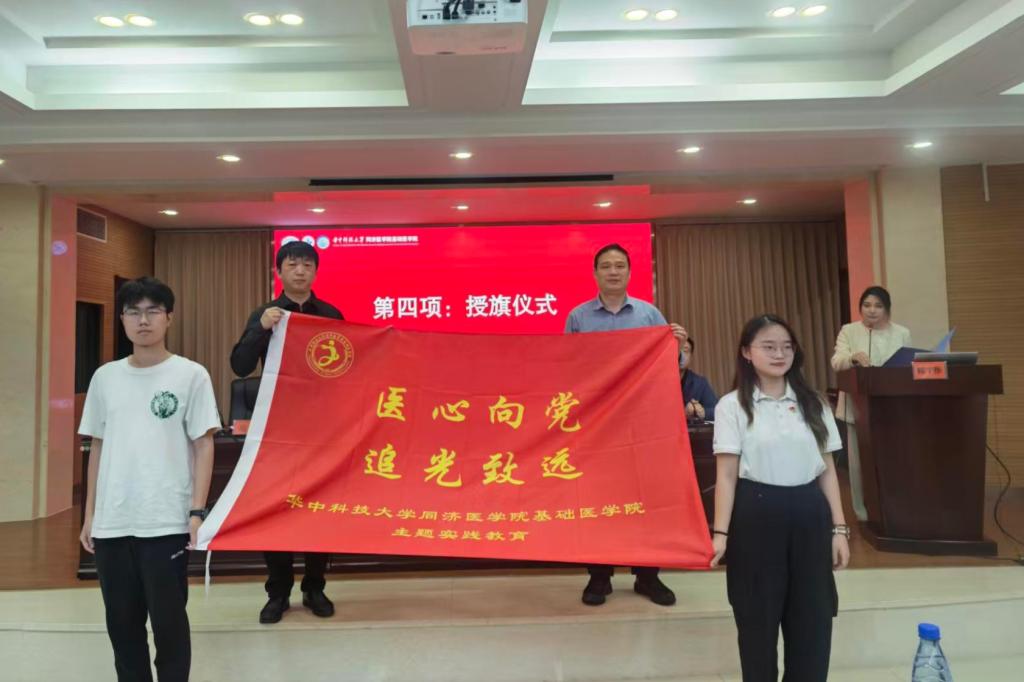 实践教育活动举行简洁庄重的开幕式并举行授旗仪式。基础医学院党委副书记田德生、湖北大别山革命传统教育基地主任胡振与同济医学院医学学工处谢可意为实践团队及各小组授旗,激励全体学员凝心聚力、笃行实干。