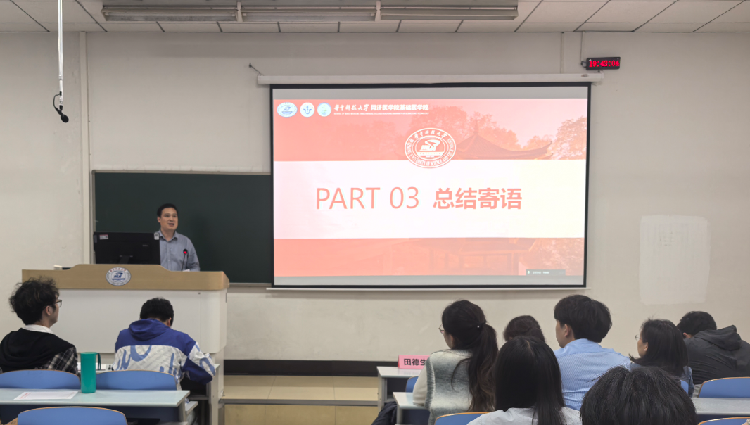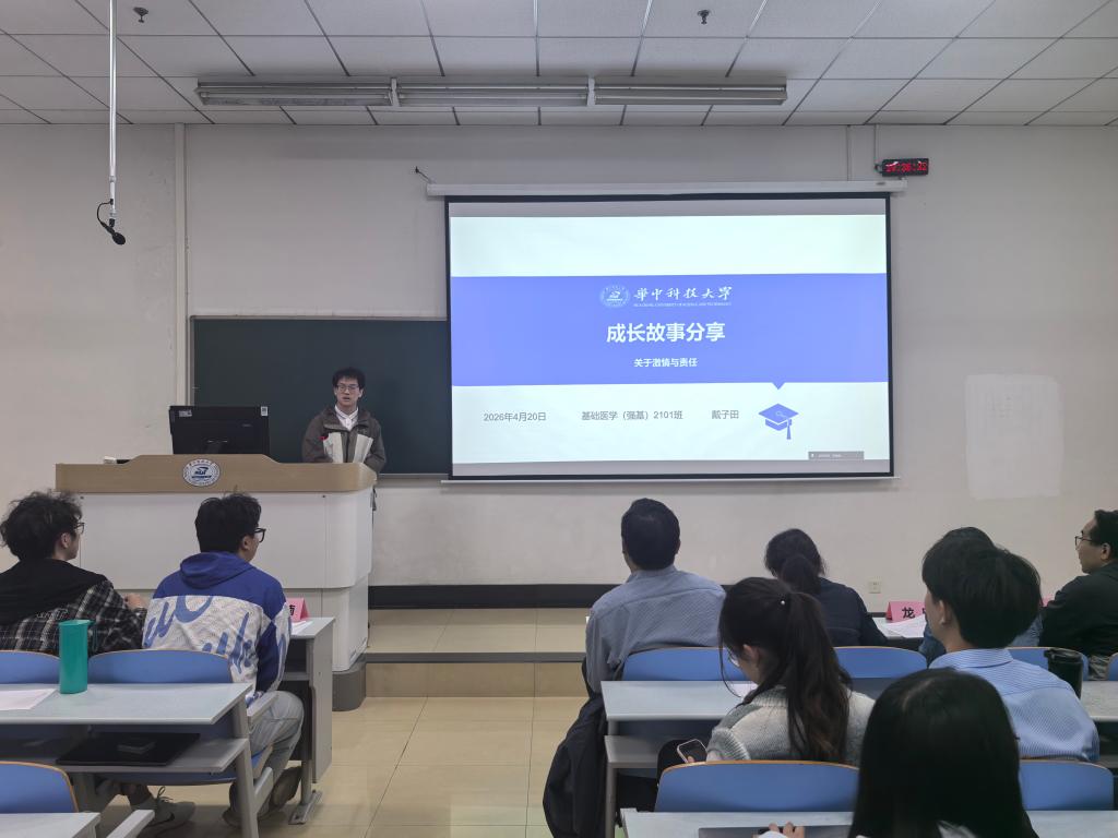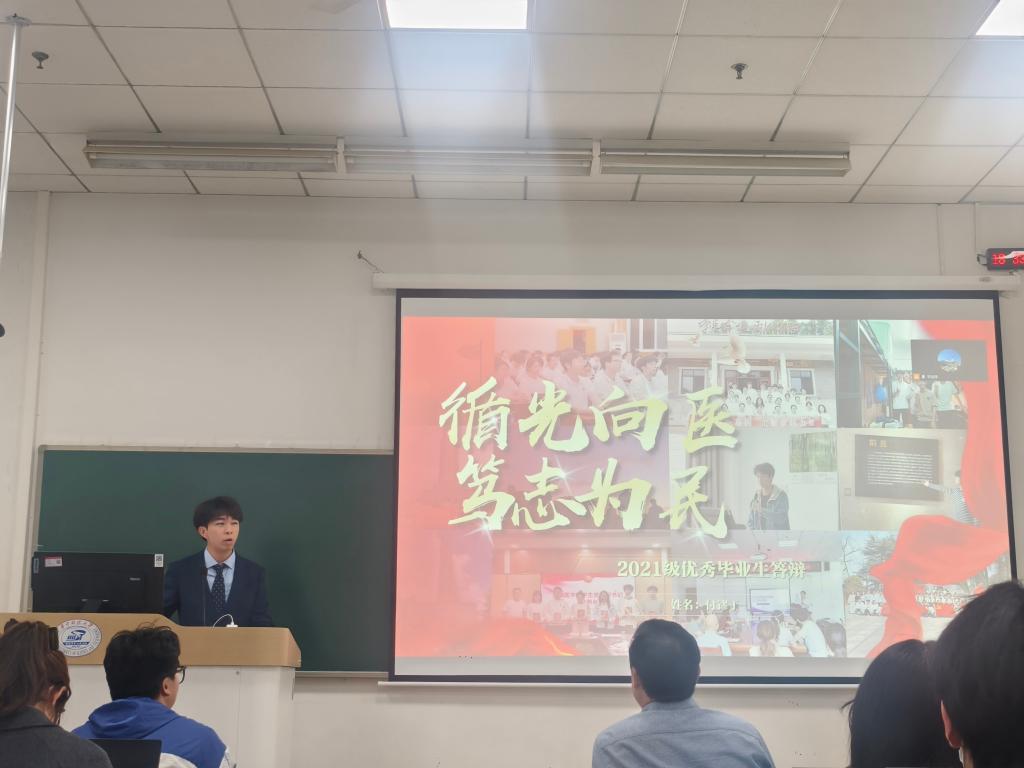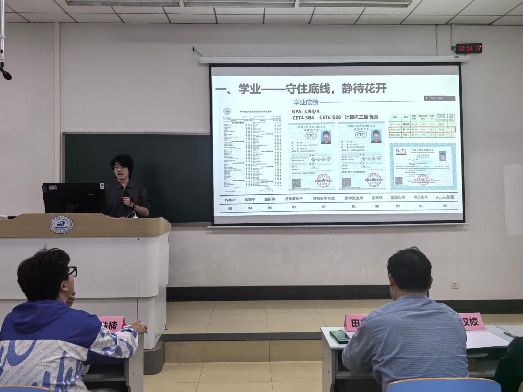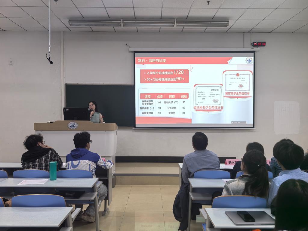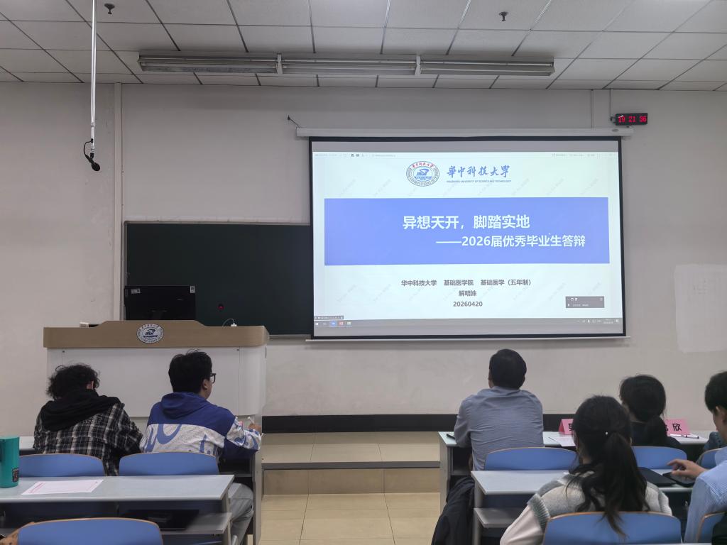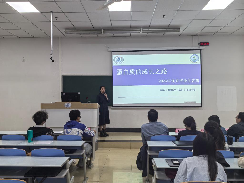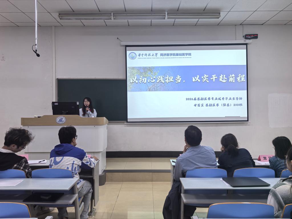 韶华逐梦,医路深耕,2026年4月20日晚,基础医学专业优秀学子报告会如约举行,本次报告会共有十位优秀学子进行分享。基础医学院党委副书记田德生、教学办公室主任晏汉姣、教师班主任代表裴磊、龙欣,学生党员代表刘浩楠、熊玳担任评委。参与本次答辩的毕业生科研素养突出,综合表现优异,充分展现了基础学子严谨求实、勤学善思的优良学风。