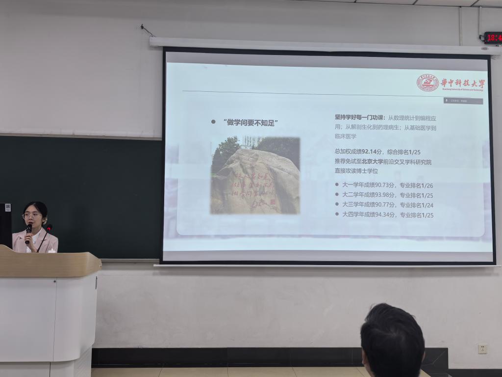 解明姝学姐从学业情况、科研经历、课外实践几个方面进行分享,还谈到了辅修计算机第二学位的经历,鼓励学弟学妹敢于尝试、探索学科交叉。科研上,她表示,可以尽早明确自身的兴趣方向,扎根在一个实验室,潜心钻研,这样会对这个方向的课题有更深刻的理解,实验技术也会得到很大进步。学姐还提出,可以参与政务见习,了解公务员的工作特点,拓宽视野。最后,她表示,希望学弟学妹相信自己,热爱自己,欣赏自己,在自己的人生路上走得更加出彩。