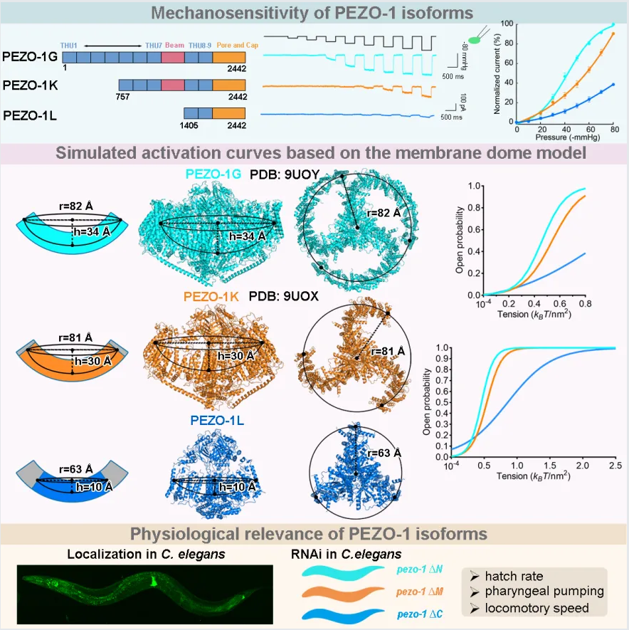 2025年11月25日,华中科技大学同济医学院基础医学院生物化学与分子生物学系郭雨松团队、林珑团队以及生理学系江漫团队在 Cell Reports 杂志上发表了题为“Membrane dome based regulation mechanism of the mechanosensitive PIEZO channel”的文章。本研究利用线虫模式体系,结合高分辨率结构解析、电生理和在体生理功能研究,提出了一个全新的PIEZO调控机制,即通过选择性剪接调节穹顶面积来调控机械敏感性。PIEZO通道是一类机械敏感性离子通道,能将机械信号转化为跨细胞膜的阳离子流。由PIEZO介导的机械转导在多种生理过程中发挥关键作用,包括触觉感知、机械性痛觉、心血管功能、免疫调节及神经发生。尽管近年来关于PIEZO通道如何通过调控下游通路参与生理过程的研究快速增长,对于PIEZO自身如何受调控以响应不同机械刺激,以及PIEZO如何在不同细胞间产生电生理特性的差异,相关机制研究还非常有限。