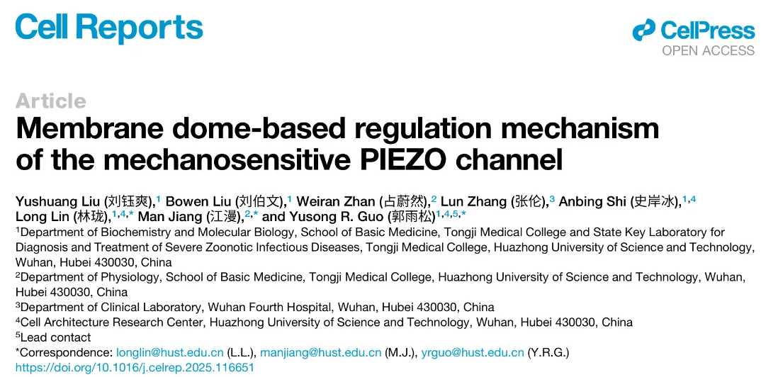 Cell Rep︱华中科技大学基础医学院郭雨松/江漫/林珑团队揭示PIEZO通道基于膜穹顶的调控新机制