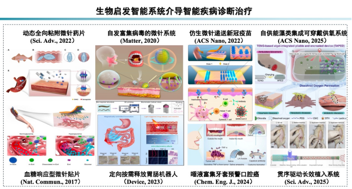 陈教授长期从事利用生物启发技术构建智控药剂及智能器件用于疾病诊断治疗的研究。围绕增强药物疗效、提升病人依从性以及增加生物样本采样准确性等关键临床问题,陈教授基于自身的研究背景,学习并借鉴自然界中存在生物原理,发展了系列生物启发智能系统:(1)模拟生物硬组织形成,制备仿生矿化药物制剂,逆转了肿瘤耐药性;(2)模拟生物自发驱动,开发了生物表面修饰及改性技术,调控生物体定向迁移特性;(3)模拟多刺生物防御,成功构建了血糖响应型微针贴片,便利、长效调控病人血糖;(4)模拟刺头蠕虫寄生,创造超强生物粘附微针药片,实现了大分子药物高效口服递送;(5)模拟鸟类舌尖采集食品,发展可富集病毒微针咽拭子提高了流行病病原体检测准确性;(6)模拟海洋生物附着,制作了定向牵引抗菌微针创可贴,高效修复感染性全层皮肤缺损;(7)模拟猪笼草液体引流,发明了智能牙套装置,实现口腔癌早期预警。第一及通讯作者已发表SCI论文40余篇,包括Sci. Adv. (2025), ACS Nano (2025),Adv. Sci. (2024),Chem. Eng. J. (2024), Small (2024), Device (2023), Adv. Drug Deliv. Rev. (2023), ACS Nano (2023), Adv. Sci. (2023), J. Control. Release (2023) Sci. Adv. (2022), Nano Lett. (2022), Adv. Mater. (2022), ACS Nano (2022), J. Nanobiotechnology (2022), Theranostics (2021),Matter (2020), Nano today (2020), Nano Lett. (2019), Adv. Drug Deliv. Rev. (2018), Nat. Commun. (2017), ACS nano (2017), Small (2014,2015), J. Control. Release (2015)等,其中影响因子大于11的论文30余篇,10项专利已获授权。以重要骨干身份参与了美国国立卫生研究院研究计划,以及麻省理工学院-诺和诺德联合研究项目,成果被NIH和MIT重点推荐,并被Cell出版社以及多家媒体相继转载。相关工作荣获首批湖北省实验室亮点科技成果,指导学生获第十八及十九届“挑战杯”全国主赛道全国一等奖、首批国家自然科学基金青年学生基础研究项目(博士研究生项)及首届中国科协青年人才托举工程博士生专项。陈教授工作已展现出较高的商业及临床转化潜力,相关工作已进入临床试验阶段。